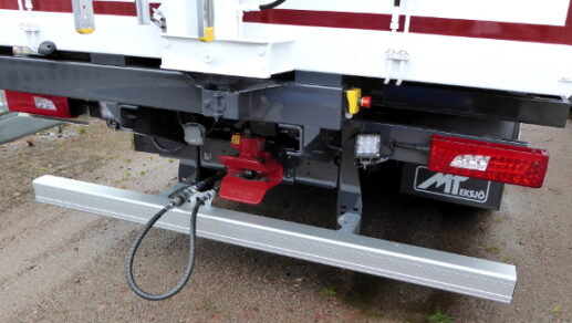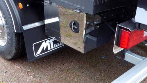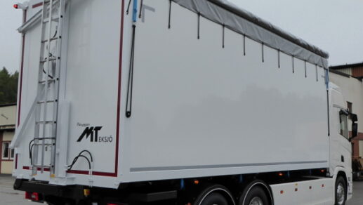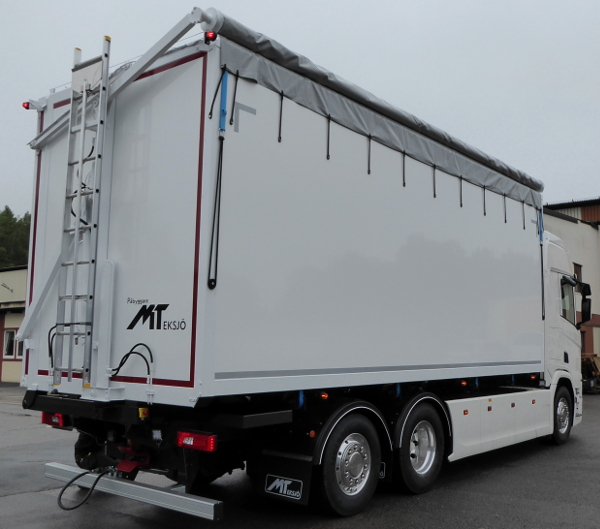 Flisbil med rulltäckning som bland annat är utrustad med följande utrustning: MT bandspännare, golv i 24mm slitplywood, MT säkerhetssystem, VBG draganordning, verktygslåda, tvärgående strölåda och flisskrapa med fäste.