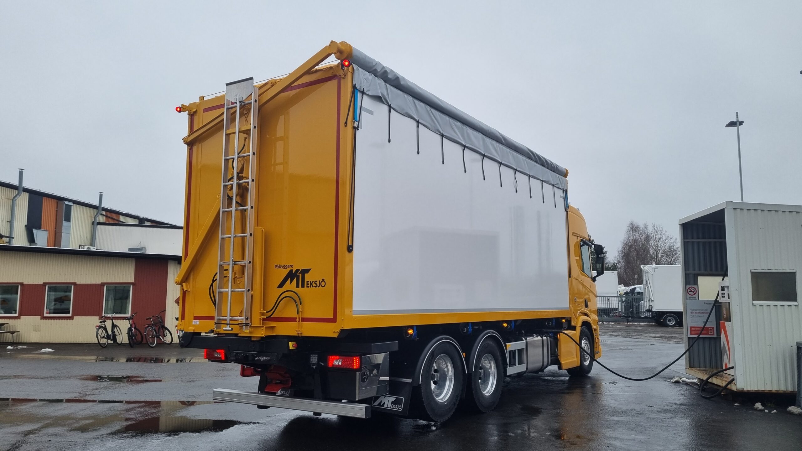 Flisbil med MT rulltäckning utrustad med bland annat Slir-Ej, Fogmaker, MT helisolerade golvskiva, MT verktygslåda, Tvärgående strölåda, VBG kopplingsanordning och MT bandspännare.