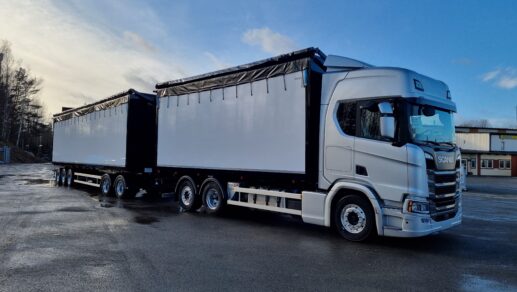 Ett flisekipage med MT rulltäckning. Släpet är en 5-axlad Eksjövagnen 18-24 med ROR-axlar. Övrig utrustning på ekipaget är bland golv i 24 mm slitplywood, Slir-ej, Fogmaker, MT bandspännare, MT strölåda och MT verktygslåda.