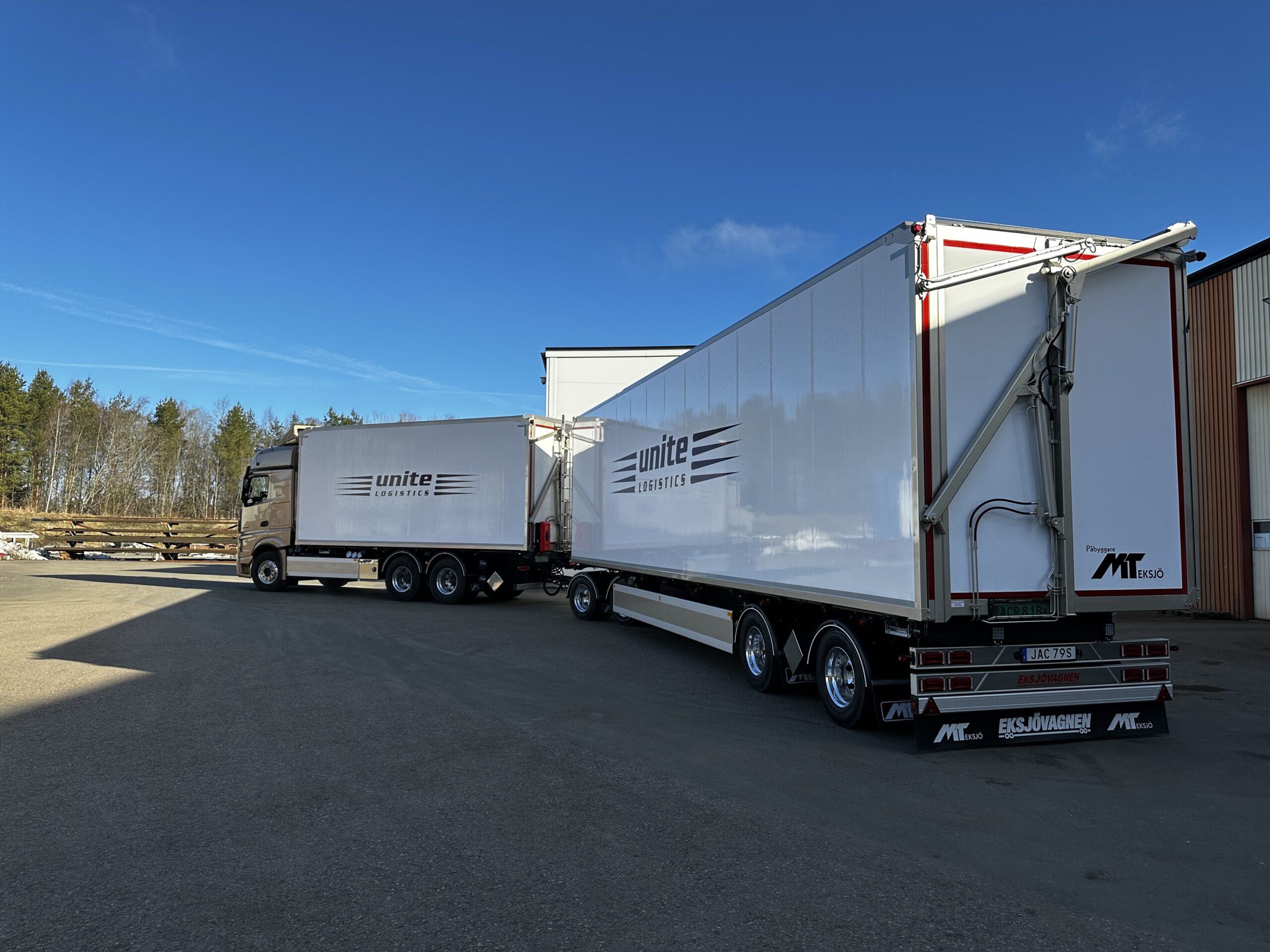 Släpet är utrustat med RoR-axlar med axellyft, MT bandspännare, MT tvärgående strölåda och golv i 24 mm slitplywood.
